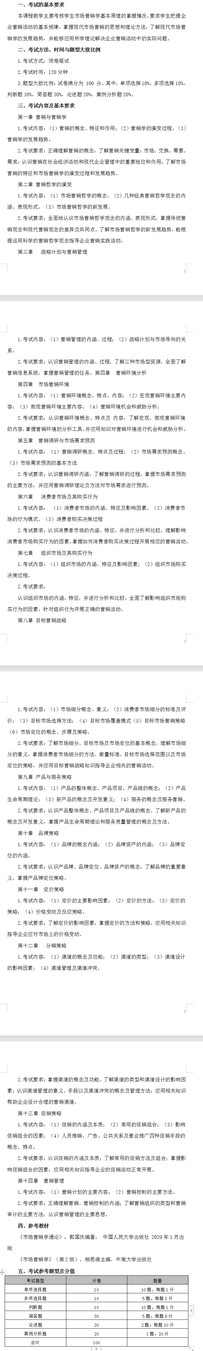 考試內(nèi)容:營銷管理,促銷策略……考試時間120分鐘,考試題型:單項選擇題,多項選擇題,判斷題,簡答題,論述題,案例分析題??偡?00分。