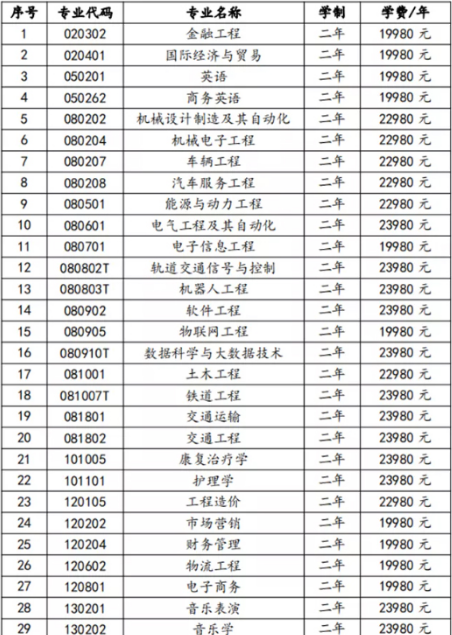 通過以上表格可以看出,該院校的2022年專升本招生專業共計29個,分別是金融工程,國際經濟與貿易,英語,商務英語,機械設計制造及其自動化,機械電子工程,車輛工程,汽車服務工程,能源與動力工程,電氣工程及其自動化,電子信息工程,軌道交通信號與控制,機器人工程,軟件工程,物聯網工程,數據科學與大數據技術,土木工程,鐵道工程,交通運輸,交通工程,康復治療學,護理學,工程造價,市場營銷,財務管理,物流工程,電子商務,音樂表演,音樂學專業。