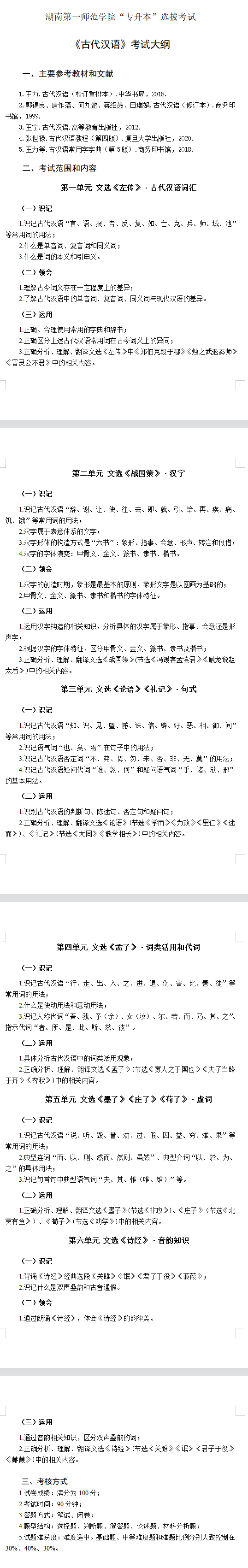 2022年湖南第一師范學院專升本《古代漢語》考試大綱