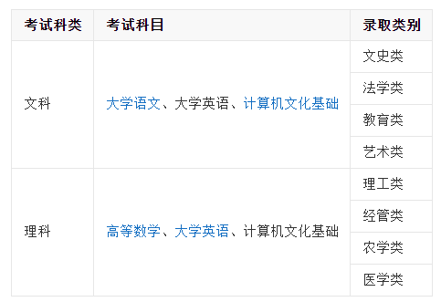 考試科目分文、理科,具體為:錄取類別由專科階段所學專業決定。